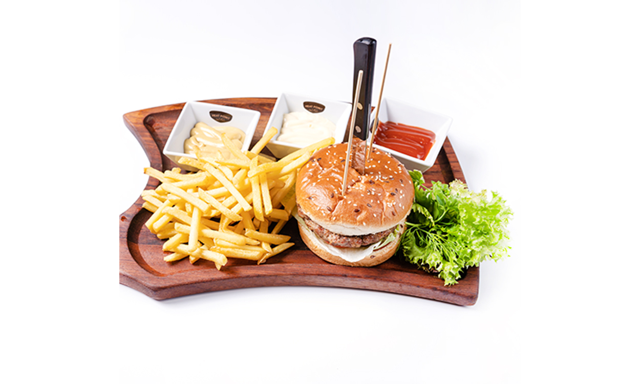 Świeża bułka naszego wypieku, kotlet wołowy 200gr, sałata, pomidor, sos Fresh burn from our bakery, beef cutlet 200gr, salat, onion, tomato, sauce