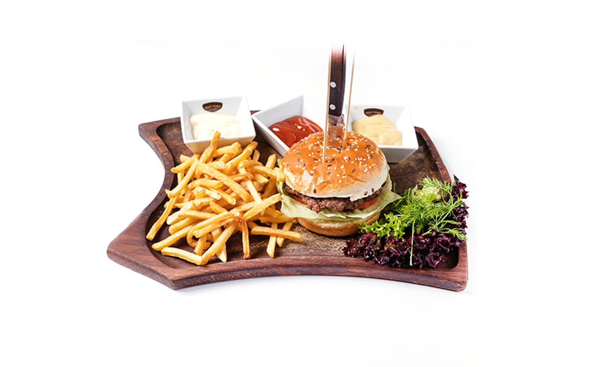 Świeża bułka naszego wypieku, kotlet wołowy 400g, sałata, pomidor, cebula, sos Fresh bun from our bakery, beef cutlet 400gr, salad, onion, tomato