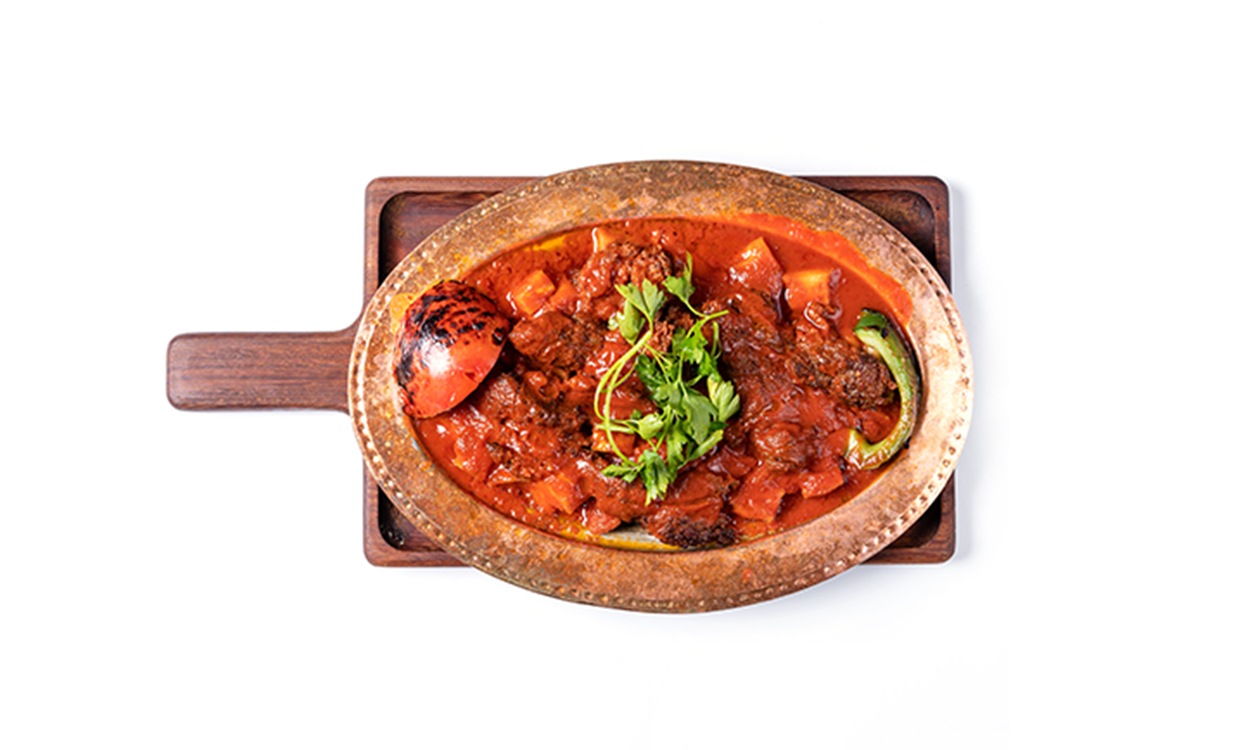 Mieszane mięso jagnięco-wołowe podawane z sosem pomidorowym, na specjalnym tureckim chlebie z jogurtem Mixed lamb and beef meat served with fresh tomato sauce, turkish bread and yogurt