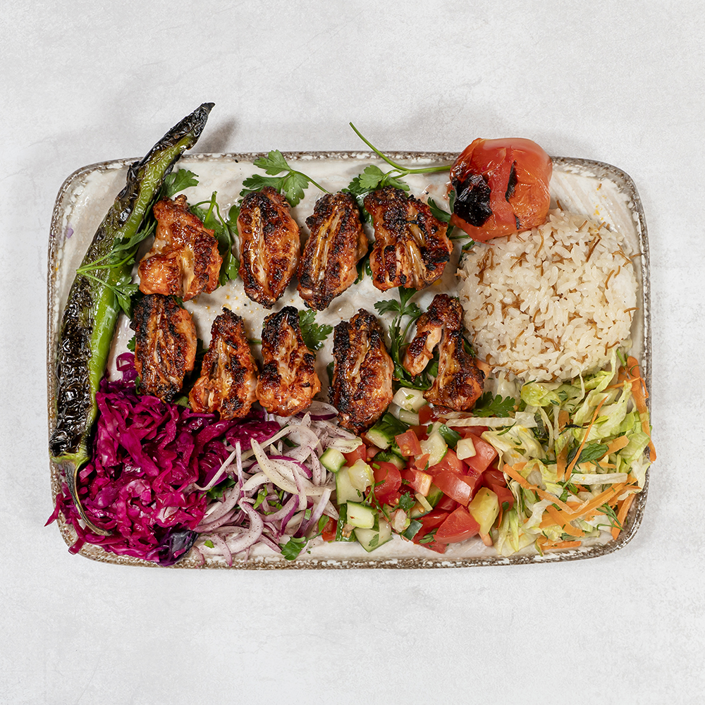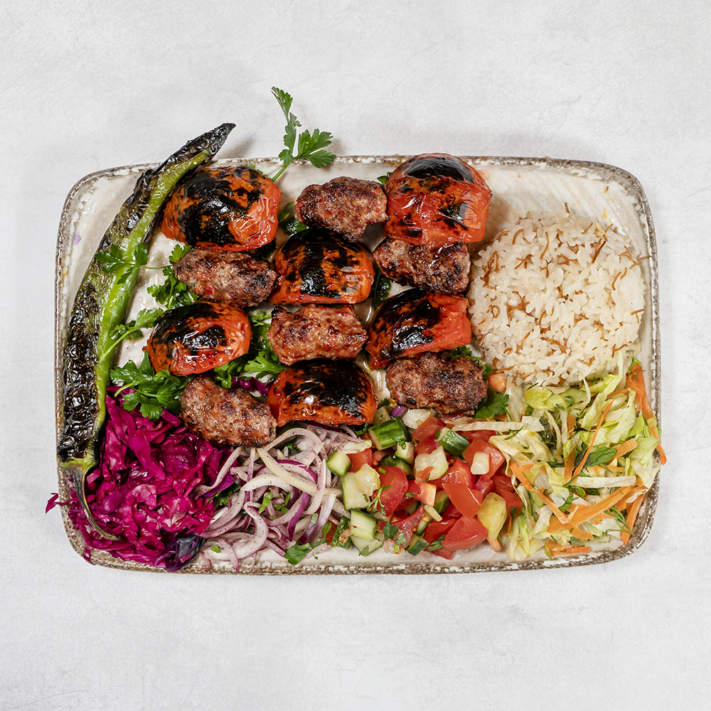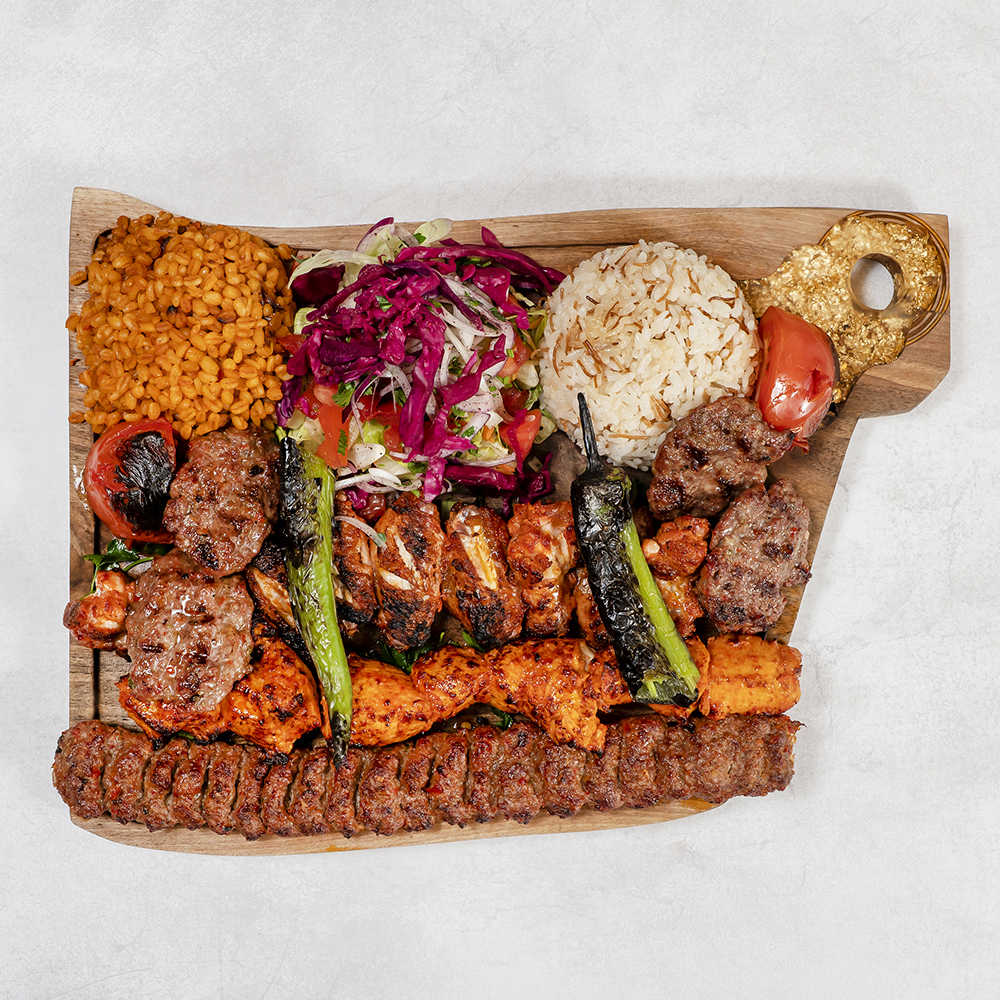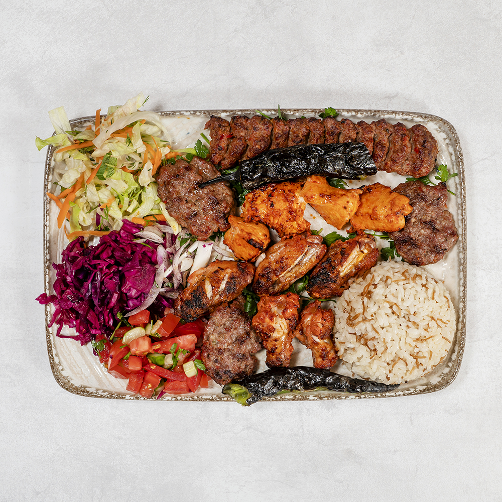 Deska degustacyjna mięs grillowanych : szaszłyk z kurczaka, skrzydełka, Adana Kebap, kotleciki jagnięco-wołowe, serwowane z ryżem lub kaszą bulgur, grillowana papryka oraz pomidor / Grilled meat tasting board: chicken shashlik, chicken wings, Adana Kebap, lamb and beef cutlets, served with rice or bulgur, grilled pepper and tomato
