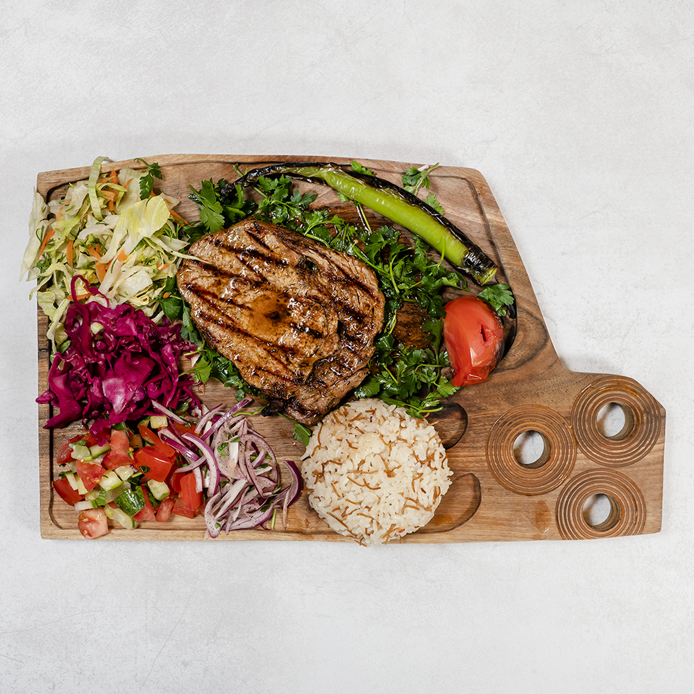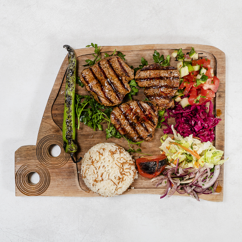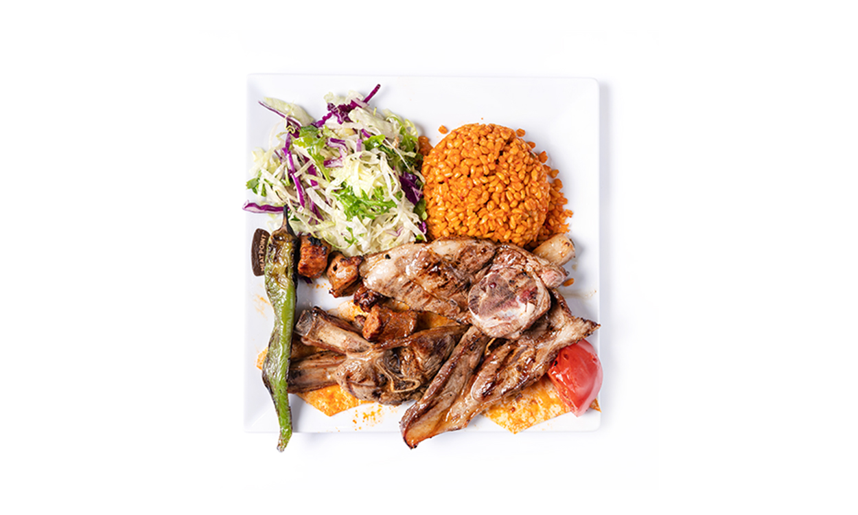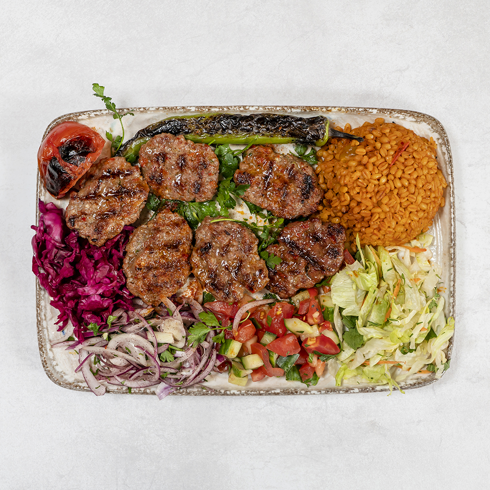 Deska degustacyjna mięs grillowanych : szaszłyk z kurczaka, skrzydełka, Adana Kebap, kotleciki jagnięco-wołowe, serwowane z ryżem lub kaszą bulgur, grillowana papryka oraz pomidor / Grilled meat tasting board: chicken shashlik, chicken wings, Adana Kebap, lamb and beef cutlets, served with rice or bulgur, grilled pepper and tomato
