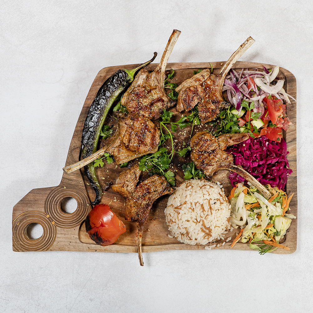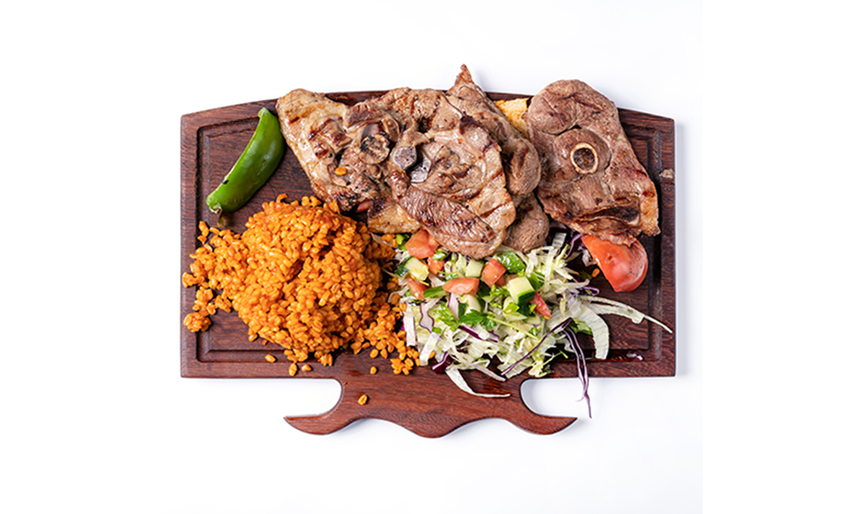 Deska degustacyjna grillowanych mięs: szaszłyk z jagnięciny, rostbef z jagnięciny, udziec jagnięcy serwowane w zestawie z ryżem lub kaszą bulgur, grillowanymi pomidorami i papryką Grilled meat testing board: lamb shashlik, roasted lamb, leg of lamb served with rice or bulgur,grilled tomato and pepper