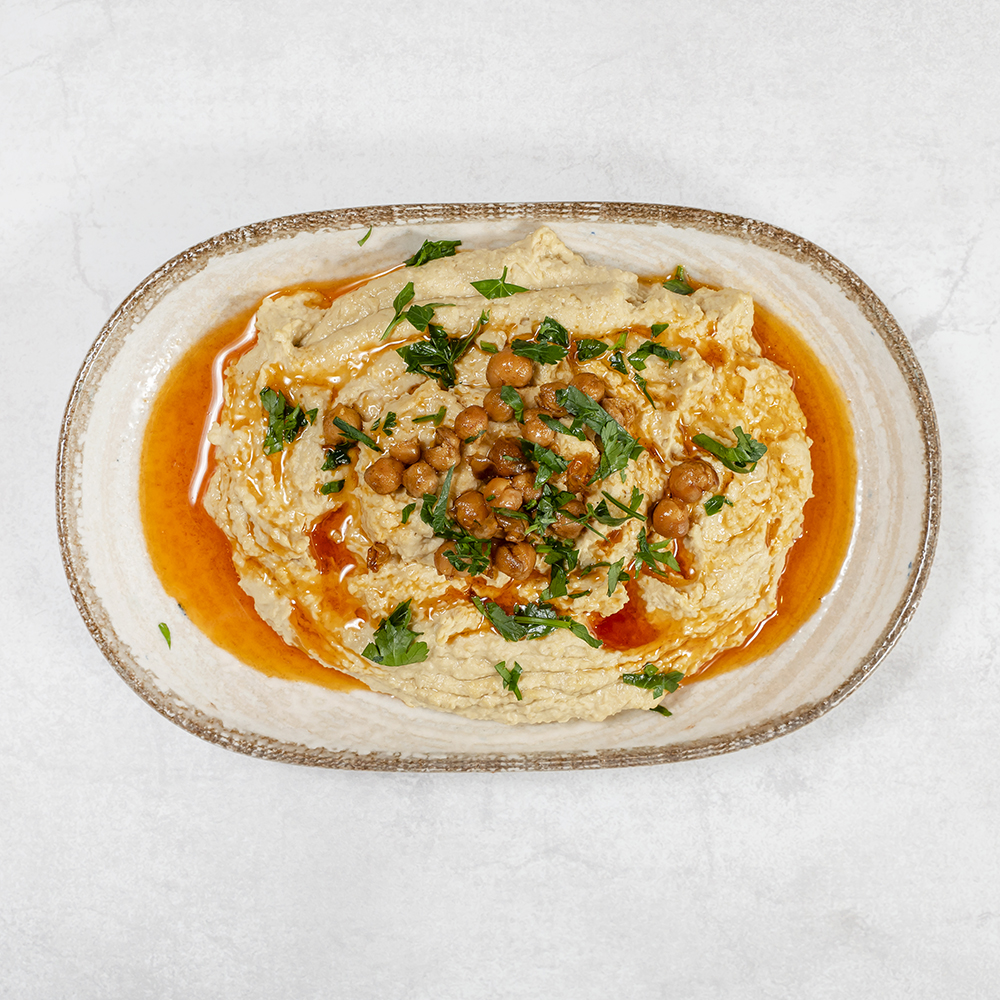 Pasta z ciecierzycy z dodatkiem świeżego czosnku, ziarna sezamowego oraz zioł Mashed chickpeas blended with fresh garlic, sesame paste and herbs