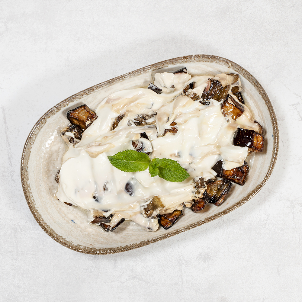 Grillowany bakłażan, przyprawiony pieprzem, w sosie jogurtowo-czosnkowym Grilled eggplant seasoned with pepper in yogurt-garlic sauce