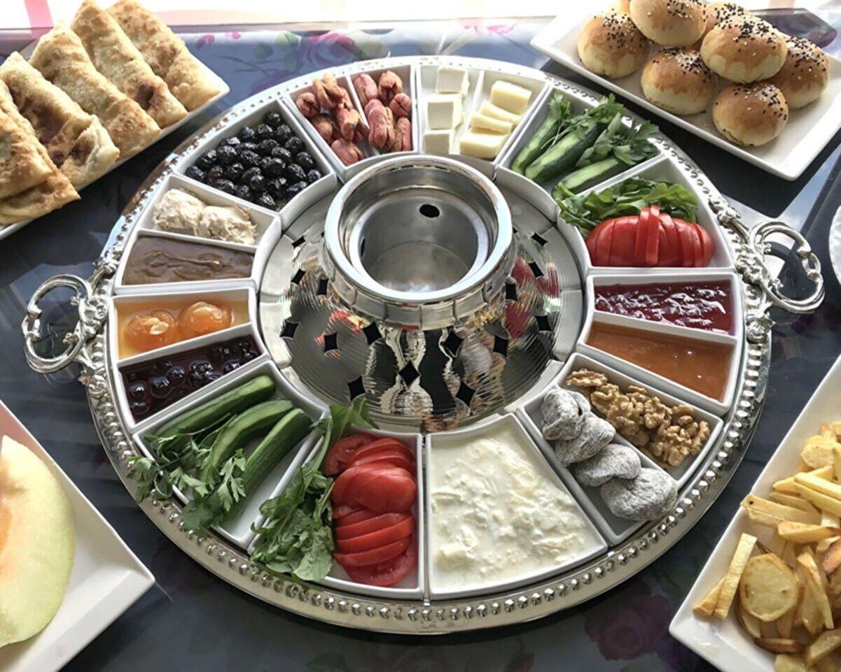 Zestawy śniadaniowe w wersji limitowanej podawane na eleganckiej tureckiej zastawie z czajnikiem herbaty. Miód, zielone oliwki, czarne oliwki, chałwa, tahini, pomidory, ogórek, ser zółty, ser feta, smażona kielbasa, frytki, dżem, chlebek Turecki, masło, dwa rodzaje Tureckiej jajecznicy sucuklu yumurta i menemen Honey butter, green olives, black olives, halva, tahini, tomatoes, cucumber, cheese, feta cheese, fried sausage, fries, jam, tea, bread, sucuklu yumurta and menemen
